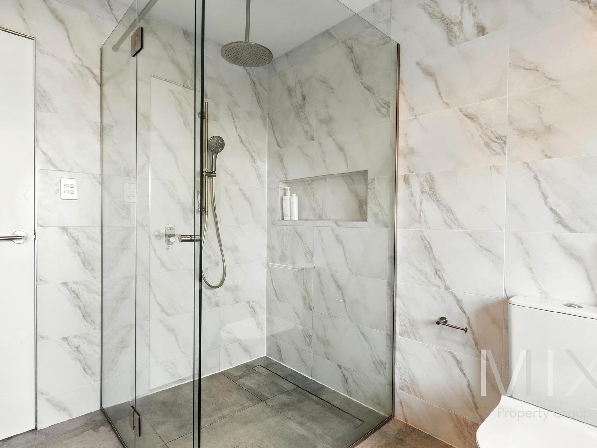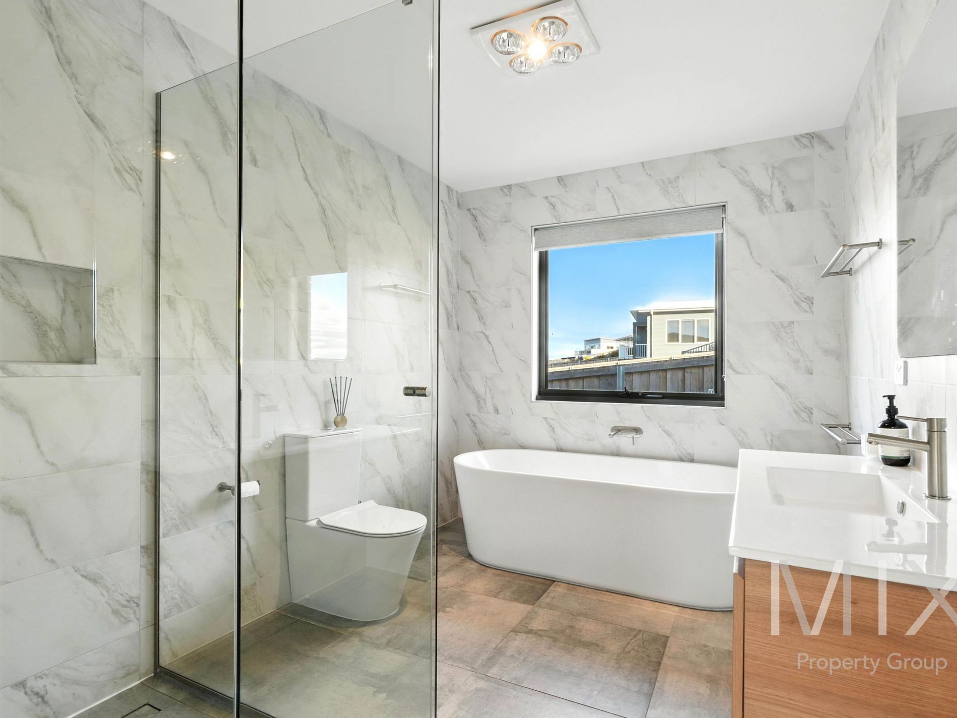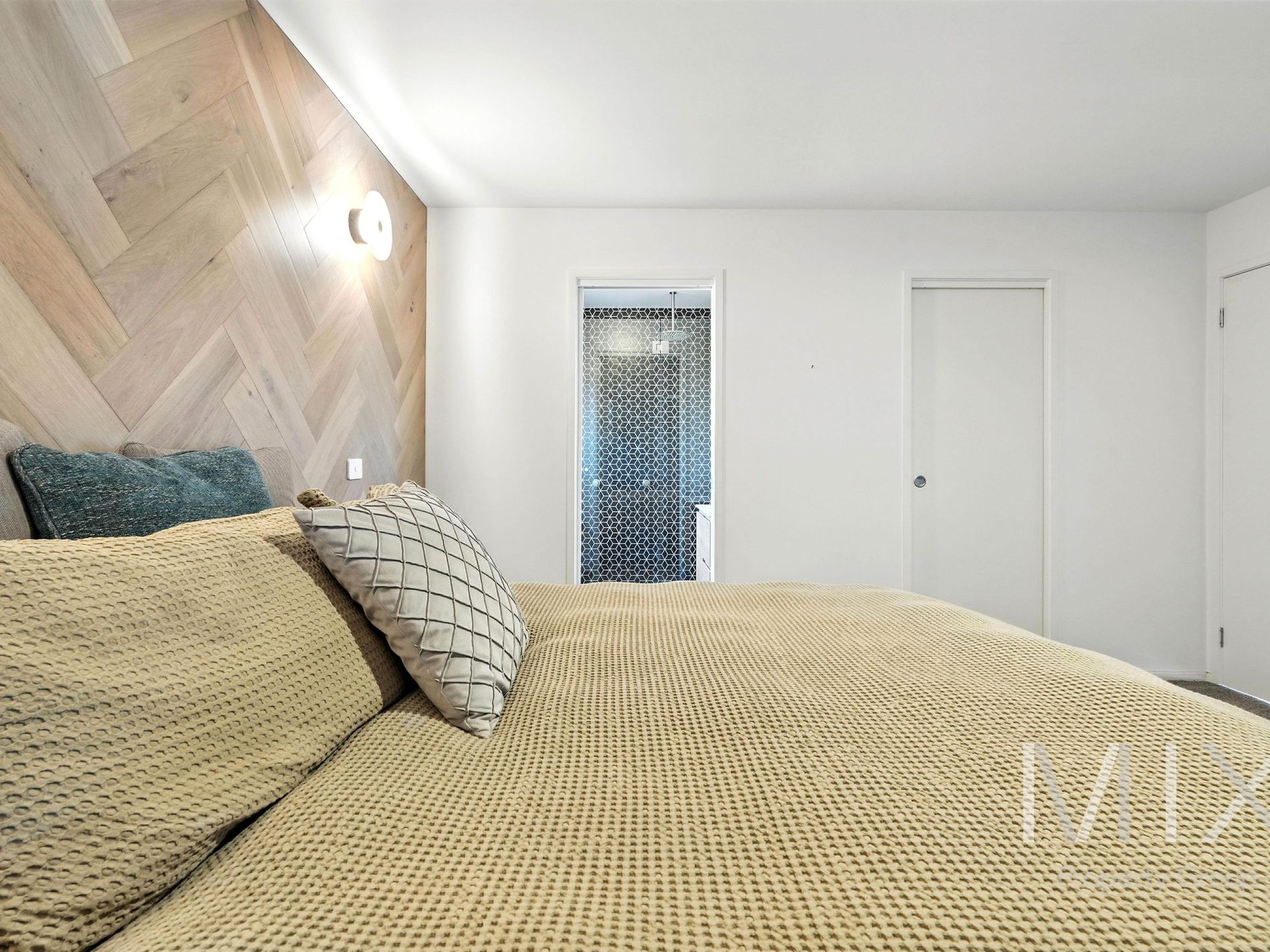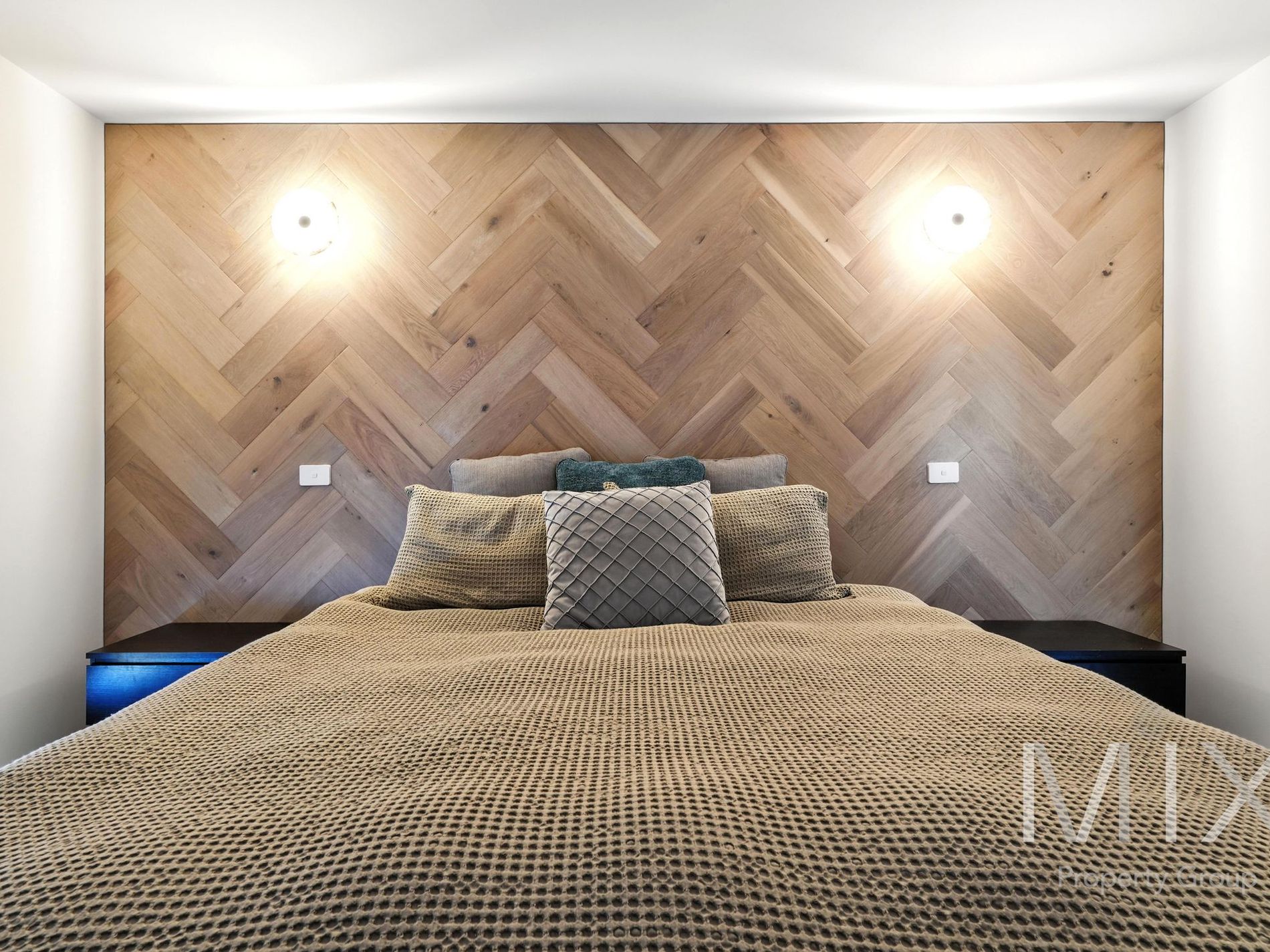 The master bedroom is privately positioned at the front of the home and features a striking herringbone timber feature wall, walk-in robe, and a luxurious ensuite with dual shower heads and floor-to-ceiling tiles. Two additional bedrooms include built-in robes and are serviced by a beautifully finished family bathroom, complete with a freestanding bath, large walk-in shower, and elegant marble-look tiling.