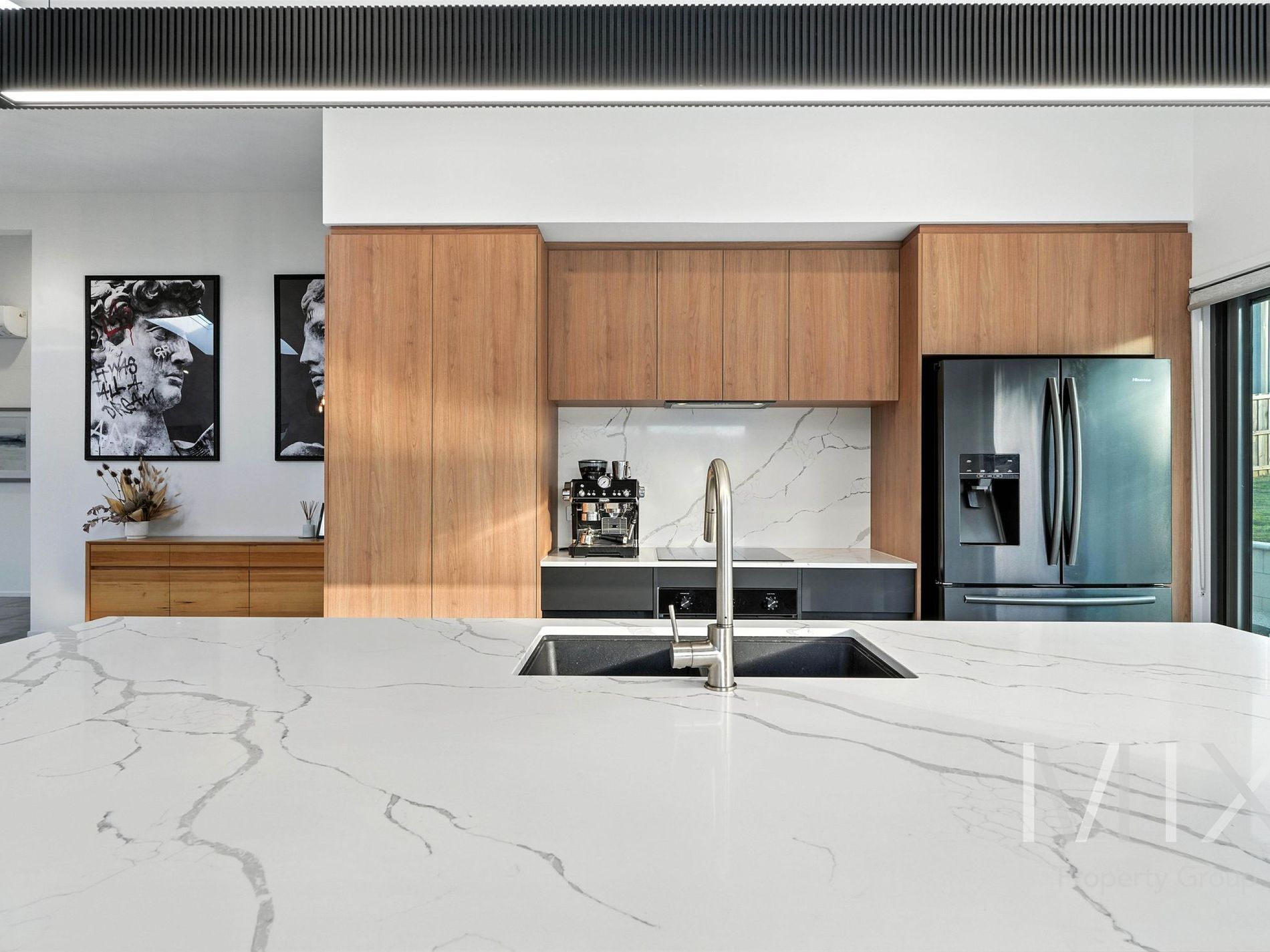 The kitchen is a true showpiece, boasting a central island bench with marble-look benchtops, an under-mount sink, and stylish two-tone cabinetry with timber accents. Large glass sliding doors connect the indoor living area to the undercover outdoor entertaining space—perfect for year-round gatherings.