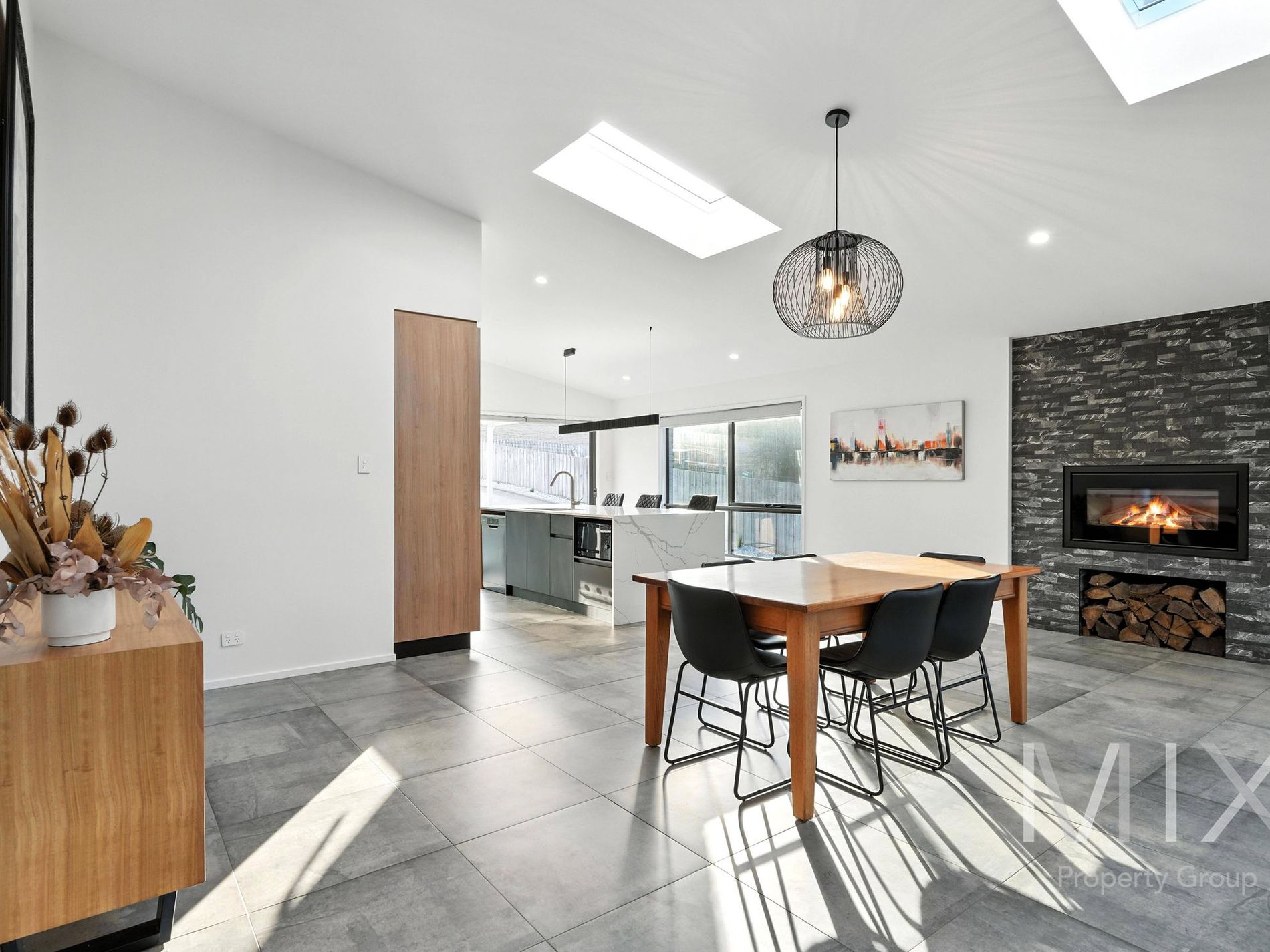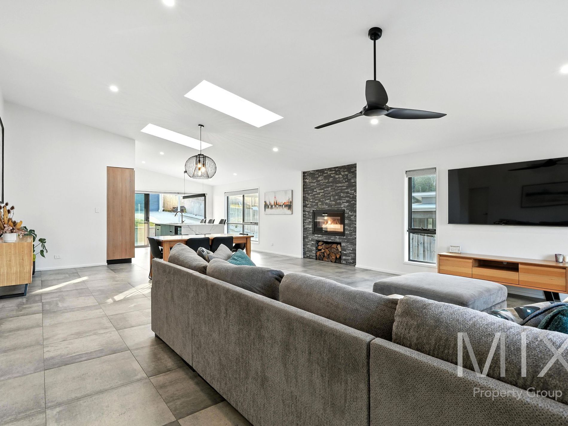 Step inside to discover a bright and expansive open-plan living area with soaring raked ceilings and skylights that flood the space with natural light. The spacious layout is ideal for entertaining and everyday family life, with the wood heater at the heart of the home providing warmth and atmosphere.