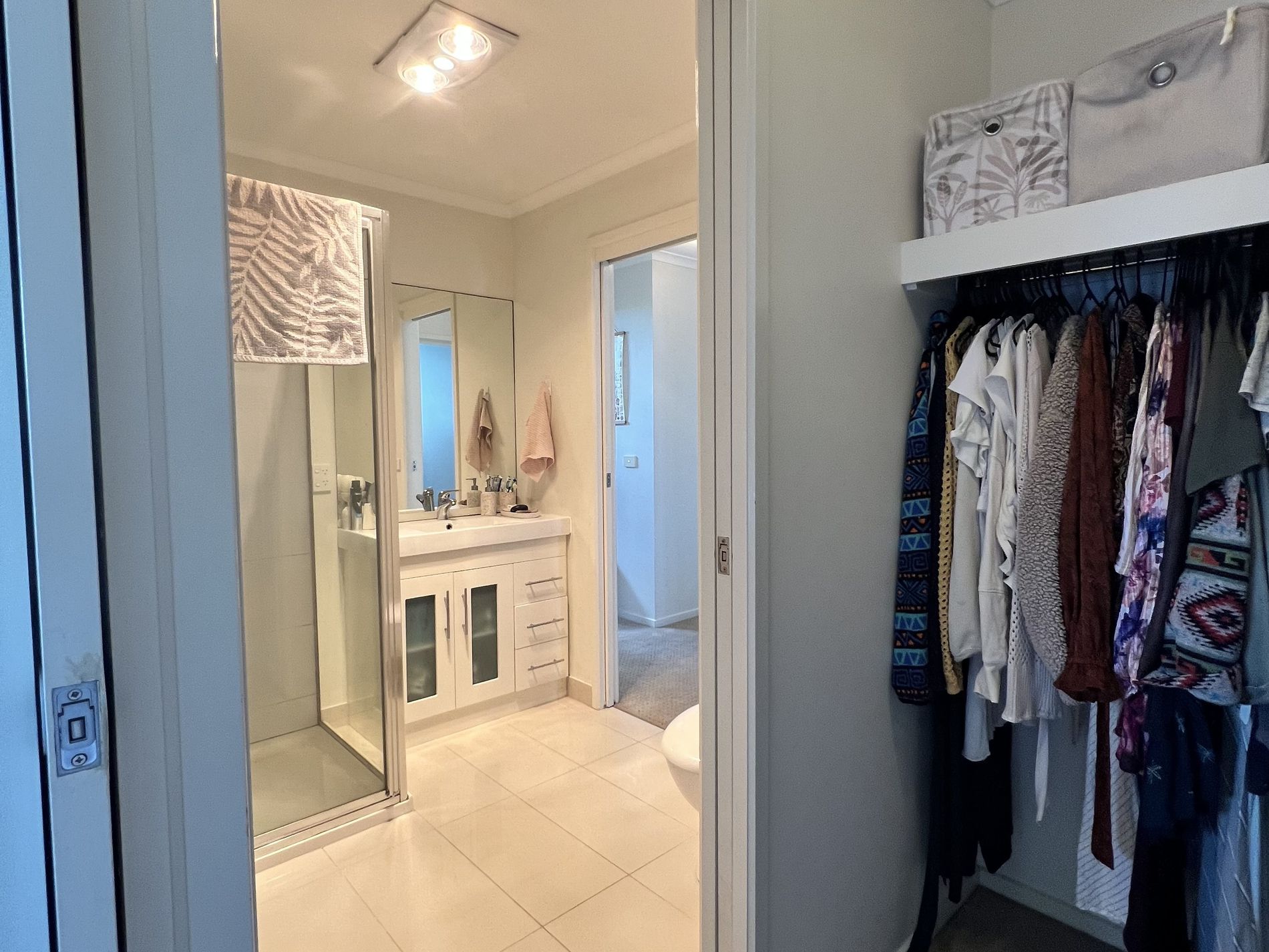 The home features three bedrooms with built-in robes, including a main bedroom with walk-in robe and dual access to the bathroom, providing added convenience and privacy. The spacious open-plan living area is filled with natural light and is kept comfortable year-round with a reverse cycle heat pump.