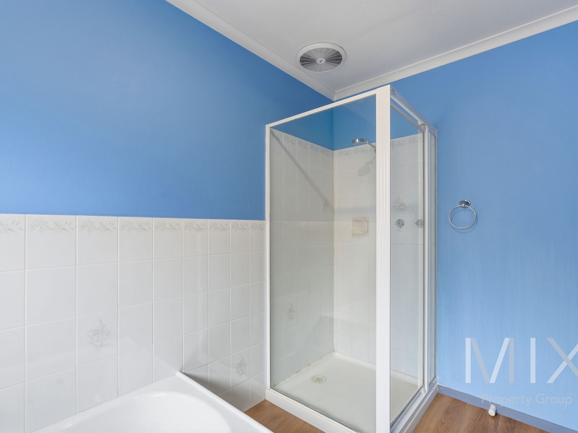 Accommodation includes two bedrooms, both with built-in robes. A spacious bathroom—rare for a villa—includes both a separate shower and bath, with the convenience of a separate toilet and a separate laundry. Additional linen storage is located in the hallway.