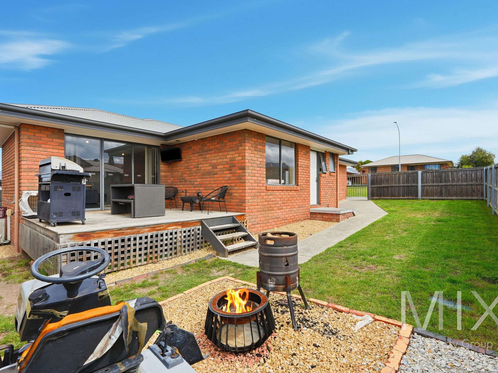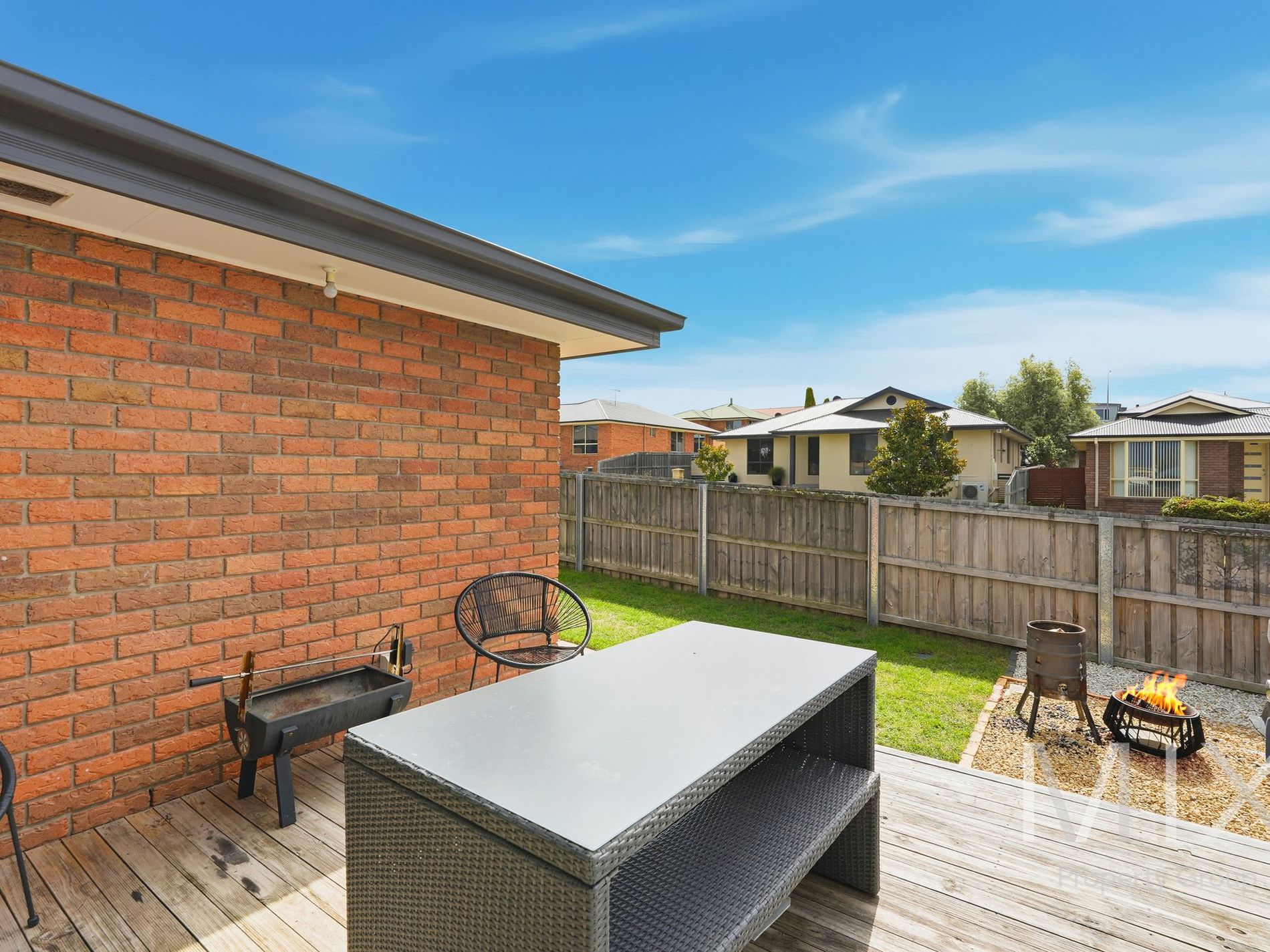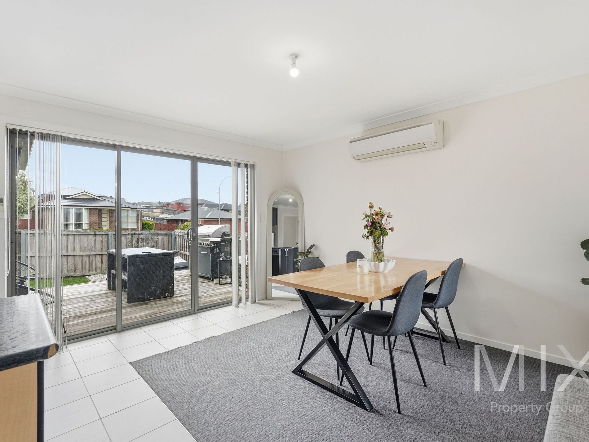Glass sliding doors from the dining area open out to an elevated timber deck—perfect for entertaining or relaxing—overlooking a secure backyard with a small lawn area, side gate access, and a water tank with pump to keep the gardens thriving.