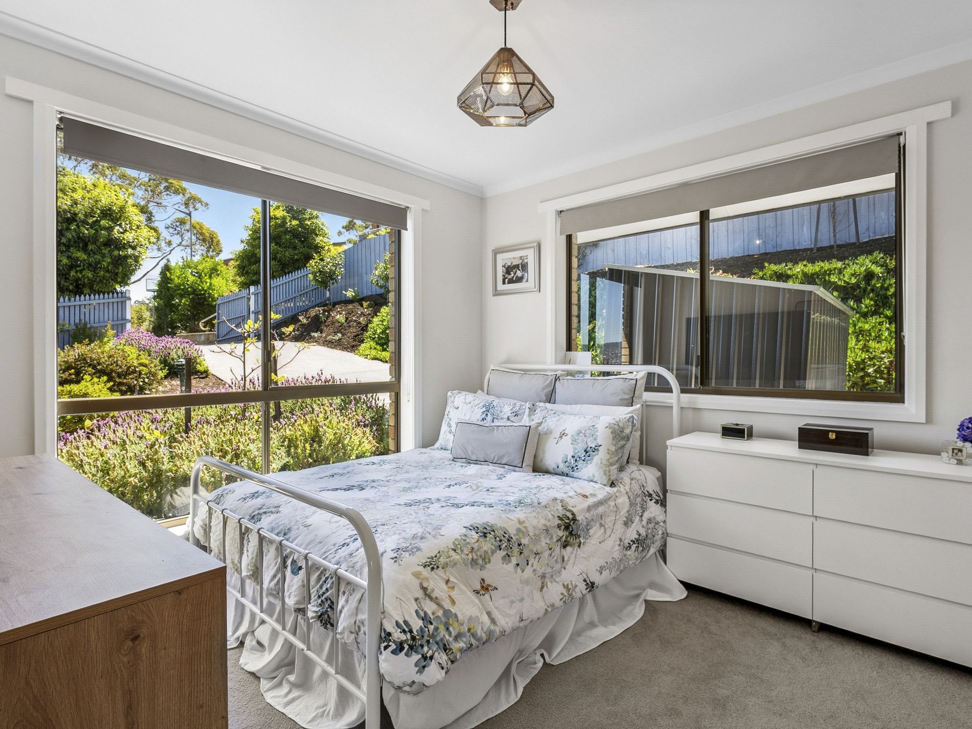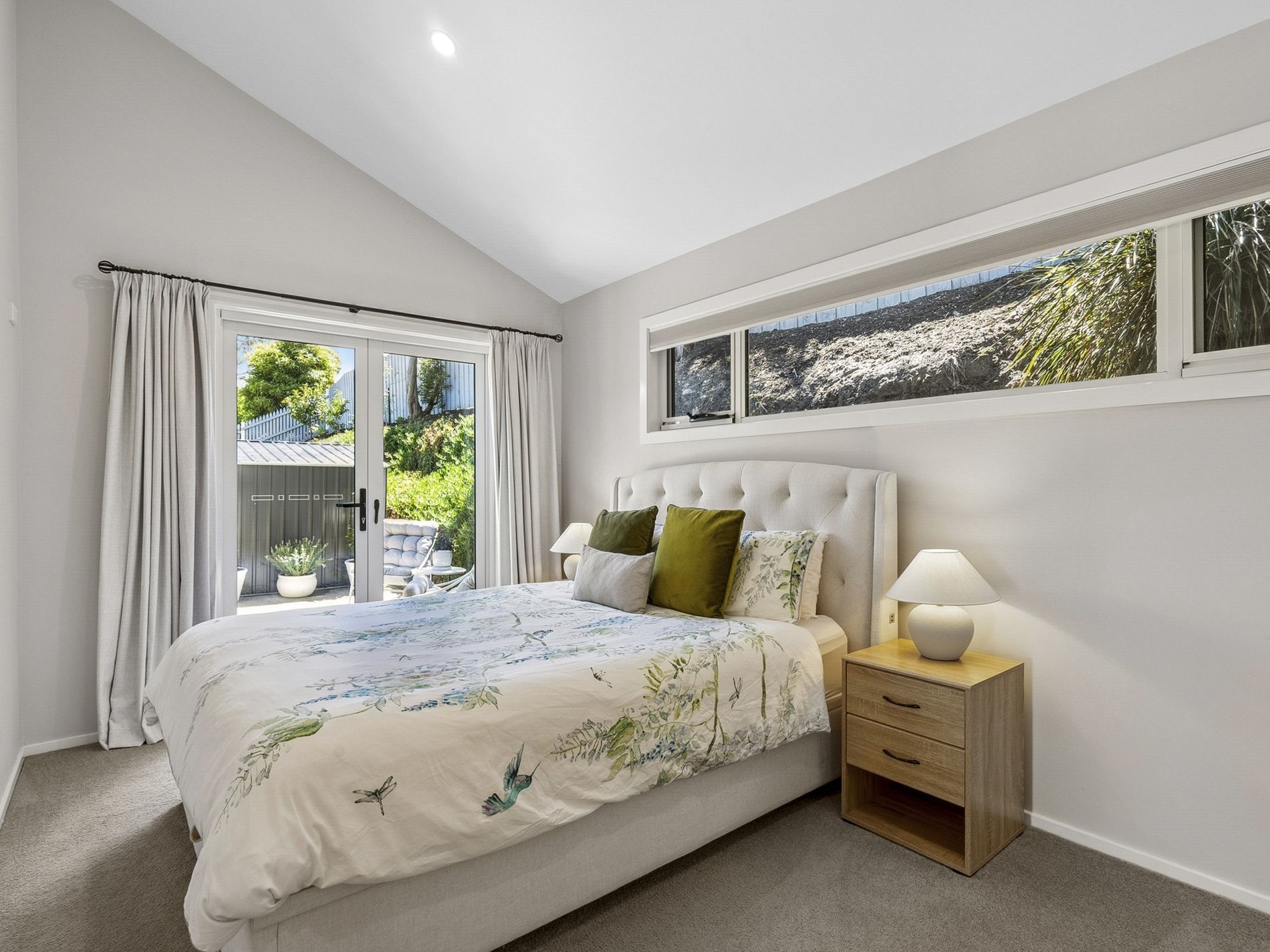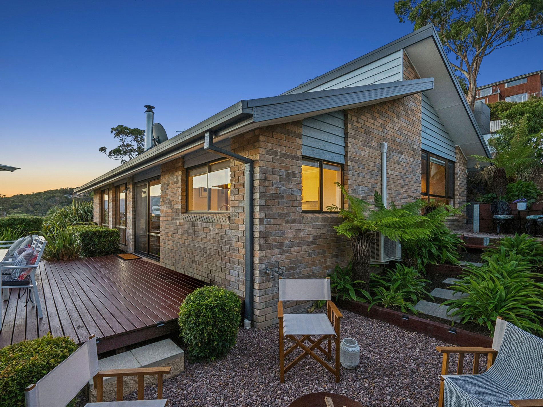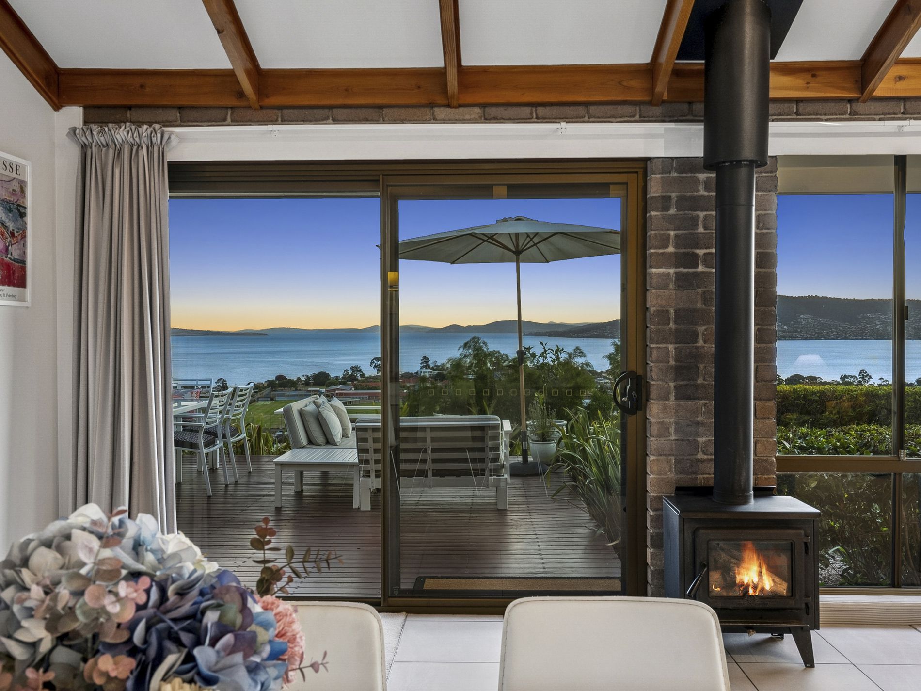 Sliding doors extend seamlessly from the main living area onto a spacious, elevated deck, creating a true indoor-outdoor lifestyle. Private and beautifully positioned, this space captures breathtaking panoramic views and provides the perfect setting for morning coffee, relaxed afternoons, or entertaining against a stunning backdrop. A dedicated fire pit area enhances the experience, while established, low-maintenance gardens frame the space and add to the home’s sense of tranquillity.